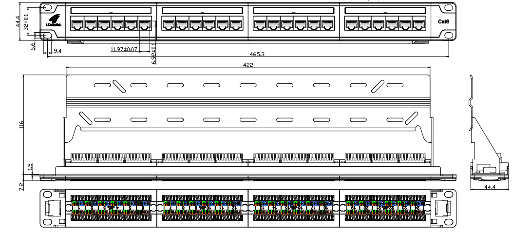 CAT5E/CAT6/CAT6A Patch Panel: Disse patchpaneler er designet specifikt til afslutning og styring af CAT5E, CAT6 eller CAT6A Ethernet -kabler. De leverer flere porte til at imødekomme forbindelsen af ​​Ethernet -kabler fra forskellige netværksenheder såsom computere, switches, routere og servere. De er typisk tilgængelige i konfigurationer såsom 24-port, 48-port eller højere, og understøtter datatransmission hastighed op til 10 Gigabit Ethernet.